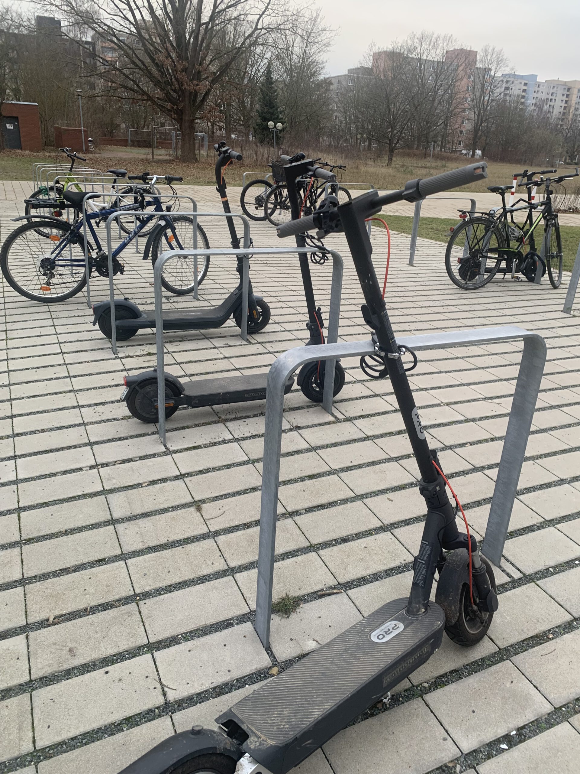E-Scooter haben kleine Räder. Bordsteine, Schlaglöcher, Schienen oder nasses Laub können schnell dazu führen, dass man stürzt. Besonders bei Regen oder im Dunkeln ist das Risiko hoch.